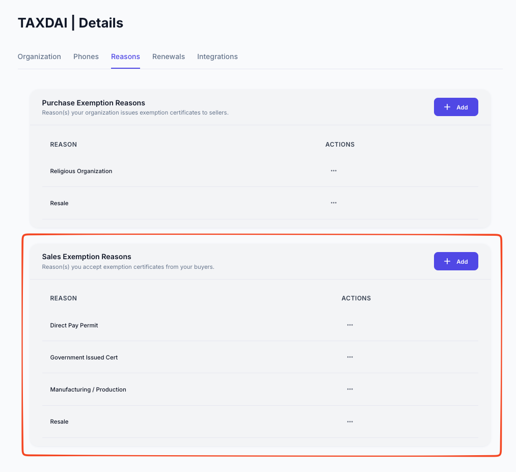 Should an organization decide that a previoulsy removed reason should be reinstated, simply press the + Add button on the top right, select the appropriate reason from the dropdown, and save the additional reason to the profile.