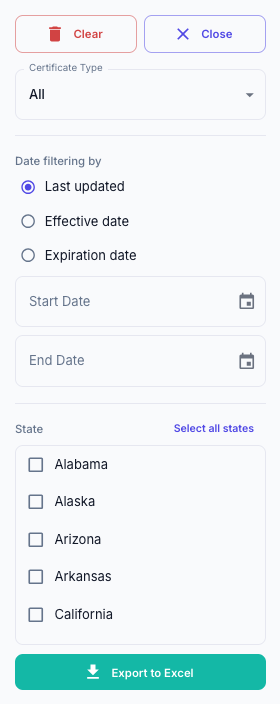 Use the filter panel to narrow results by certificate type, date, state, and export your selection to Excel.