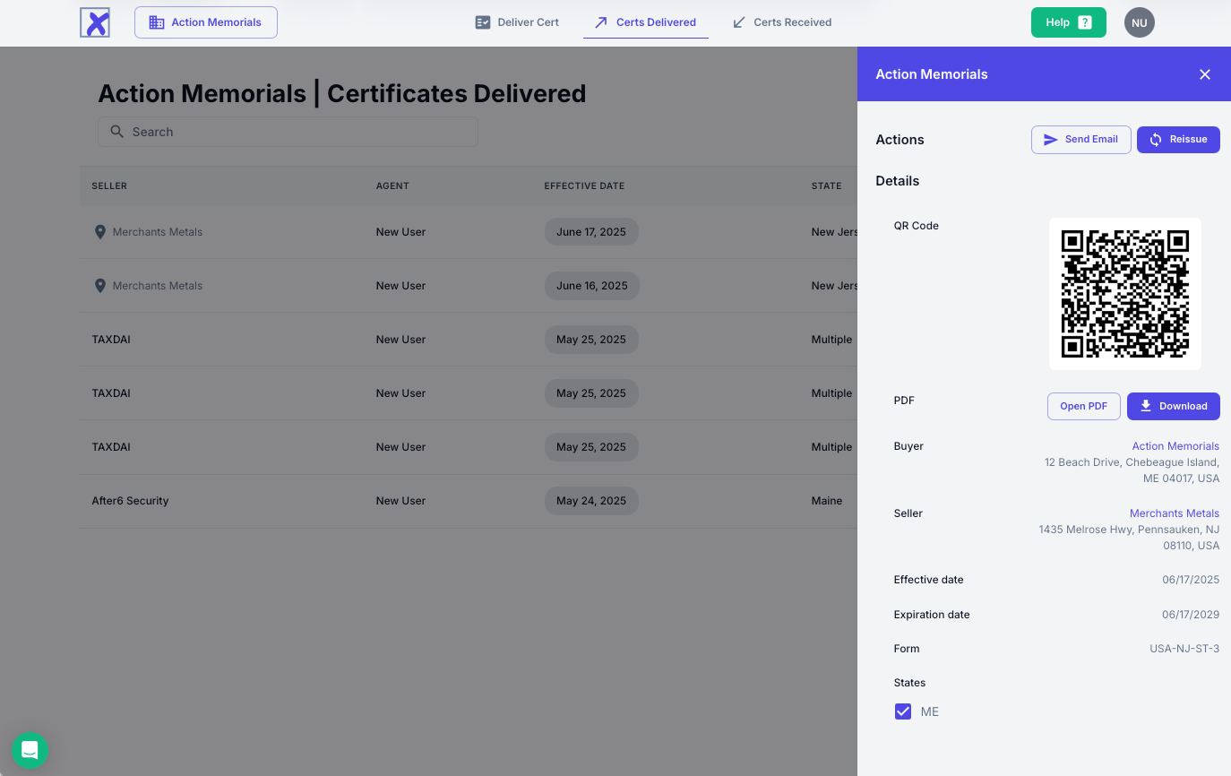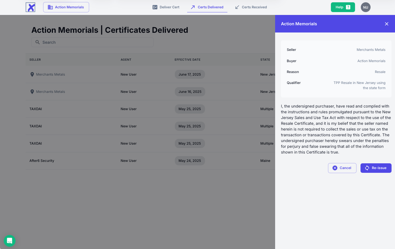 To reissue an updated version of the same certificate to the seller, press the reissue button, and reissue a confirmation that all of the information on the certificate is accurate.